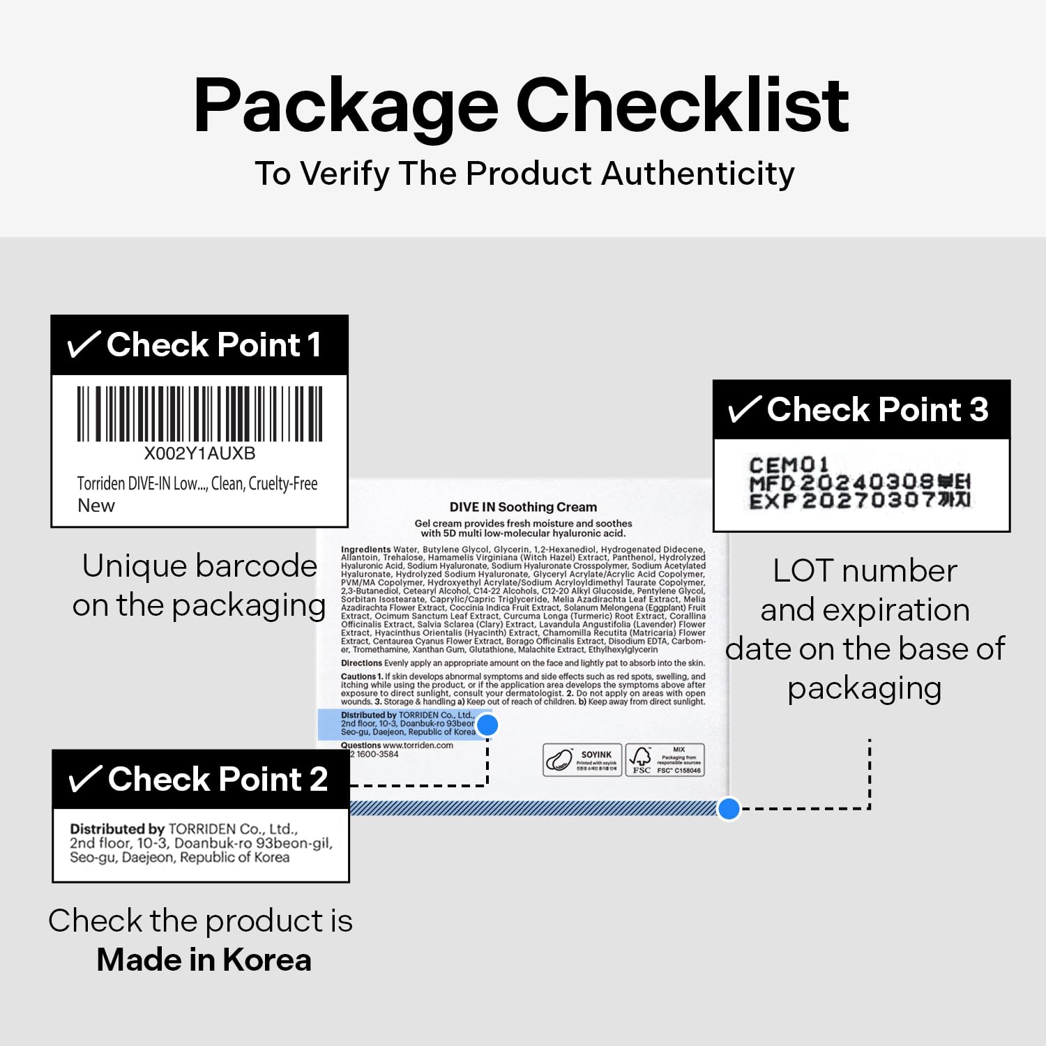 ALL-DAY HYDRATION SOOTHING CREAM : This hydrating cream deeply soothes and moisturizes the skin from within. Its bouncy and elastic gel-like texture absorbs quickly into your skin without stickiness. Achieve plump skin with this Korean Hyaluronic Acid soothing cream. 5D HYALURONIC ACID COMPLEX FOR DEEP HYDRATION : Formulated with 5 types of high, mid and low molecular weight Hyaluronic Acid, this unique 5D complex structure builds 3D networks within the skin layers to deliver moisture deeply and evenly across multiple layers, leaving your skin deeply hydrated and plump. BOUNCY AND ELASTIC GEL-TYPE CREAM : Focused on moisturizing, soothing and preventing moisture loss, it absorbs quickly and deeply. The bouncy and elastic gel-like texture gives your skin the last bit of moisture and hydration it needs to complete your skincare routine. GENTLE FORMULA for SENSITIVE SKIN : Free from parabens, formaldehydes, phthalates, coal tar, hydroquinone, SLS, SLES, triclocarban, triclosan, and other commonly known irritants. Clinically tested to be non-irritating, this formula is suitable for sensitive skin, providing soothing & calming care. CLEAN BEAUTY & SUSTAINABILITY : We are committed to clean and sustainable beauty. Torriden uses 50% recycled plastic bottles, easy-to-remove recyclable labels, FSC-certified 100% recycled paper, and soy-based eco-friendly ink. All products are formulated without animal-derived ingredients and certified VEGAN.